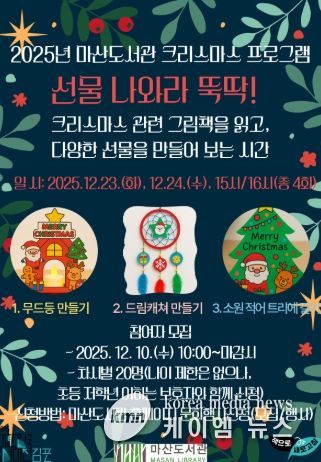 (케이엠뉴스) 김포시 마산도서관은 오는 12월 23일과 24일 이틀에 거쳐 크리스마스를 기념한 체험프로그램 ‘선물 나와라 뚝딱!’이 진행된다.