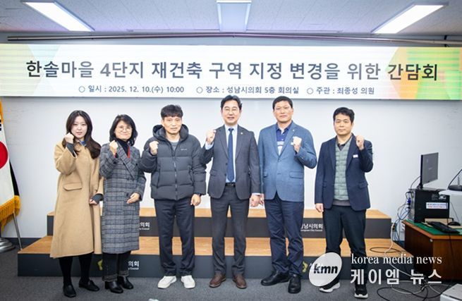 (케이엠뉴스) 성남시의회 더불어민주당 최종성 의원(분당,수내3,정자2·3,구미)은 12월 10일 성남시의회 5층 회의실에서 ‘한솔마을 4단지 재건축 구역 지정 변경 간담회’를 개최했다고 밝혔다.