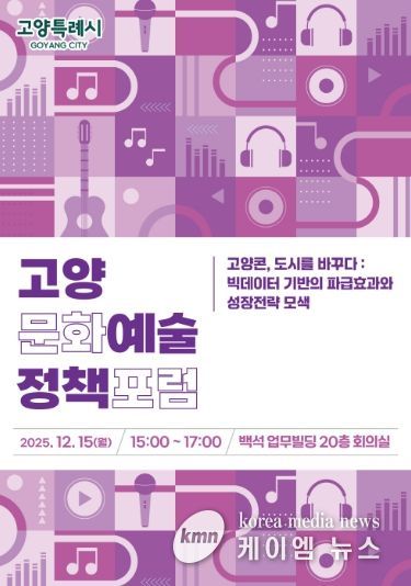 (케이엠뉴스) 고양특례시는 오는 15일 오후 3시, 백석업무빌딩 20층 회의실에서 ‘2025 고양문화예술정책포럼’을 개최한다고 밝혔다.