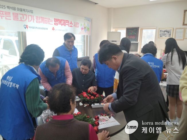 (케이엠뉴스) 양주시 백석읍 지역사회보장협의체가 지난 17일 연말을 맞아 백석읍 가업1리 경로당에서 ‘푸른 물고기가 함께하는 행복제작소’ 사업의 일환으로 크리스마스 리스와 무드등 만들기 활동을 진행했다.