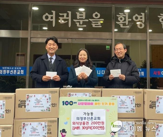 (케이엠뉴스) 의정부시 가능동주민센터는 12월 19일 의정부신촌교회가 성탄절을 맞아 외식상품권 200만 원과 김세트 100만 원 상당을 기탁하며 ‘100일간 사랑릴레이 배턴 잇기’에 동참했다고 밝혔다.