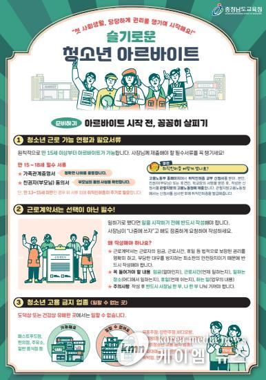 (케이엠뉴스) 충남교육청은 학기 말 방학을 앞두고 아르바이트 학생의 증가가 예상됨에 따라 일하는 청소년의 권리 보호를 위한‘슬기로운 청소년 아르바이트’ 교육자료를 개발·보급했다.