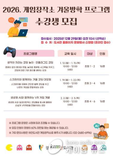 교육과정은 2026년 1월 12일부터 2월 5일까지 운영하며, ▲‘생각이 자라는 코딩놀이: 언플러그드 코딩’ ▲‘스크래치와 함께하는 겨울 코딩 대모험’ ▲‘생성형 AI와 함께하는 VR 게임 개발’ 등 총 3개 과정으로 진행한다.