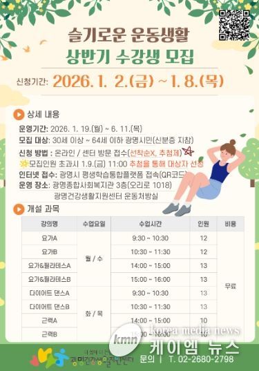 (케이엠뉴스) 광명시 광명건강생활지원센터는 새해를 맞아 시민들의 건강한 생활습관 형성과 만성질환 예방을 위해 2026년 상반기 ‘슬기로운 운동생활’ 운동 프로그램 참여자를 모집한다.