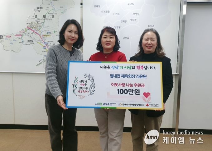 (케이엠뉴스) 남양주시는 지난 19일 김윤원 별내면 체육회장이 지역 내 취약 가구 지원을 위해 이웃사랑 성금 100만 원을 별내면 지역사회보장협의체에 기탁했다고 22일 밝혔다.