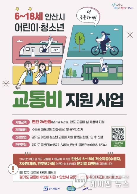 (케이엠뉴스) 안산시는 지역 내 어린이·청소년의 교통비 부담 완화와 이동권 보장을 위해 내년 1월부터 ‘안산시 어린이·청소년 교통비 지원 사업’을 본격 시행한다고 23일 밝혔다.