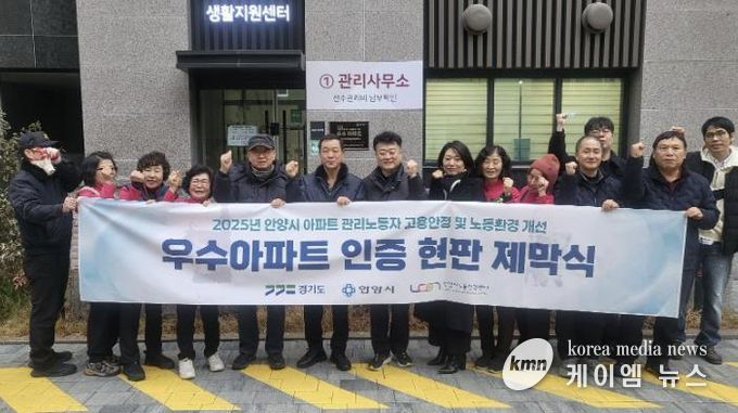 (케이엠뉴스) 안양시노동인권센터는 지난 20일 ‘2025년 고용안정 및 노동환경 개선 우수아파트’로 선정된 래미안안양메가트리아와 힐스테이트인덕원역베르텍스 아파트에서 ‘우수아파트 인증 현판식’을 진행했다고 23일 밝혔다.