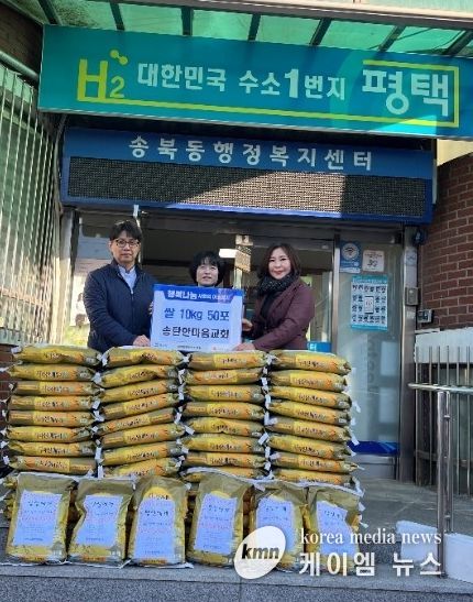 (케이엠뉴스) 송탄한마음교회는 최근 크리스마스를 맞아 어려운 이웃들에게 따뜻한 마음을 전하기 위해 쌀 10㎏ 50포(총 500㎏)를 평택시 송북동 행정복지센터에 전달했다.