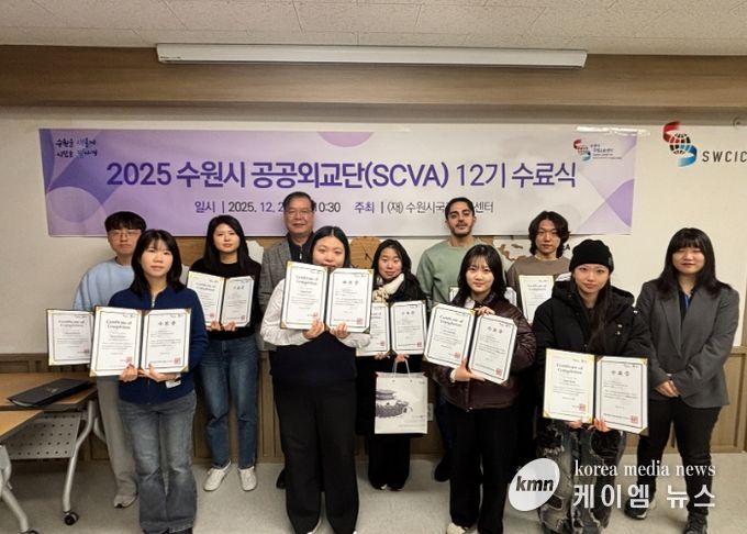(케이엠뉴스) 수원시국제교류센터가 22일 센터에서 ‘수원시 공공외교단(SCVA) 12기’ 수료식을 열고, 단원 16명에게 수료증을 전달했다. 우수활동자 4명에게는 상장을 수여했다.