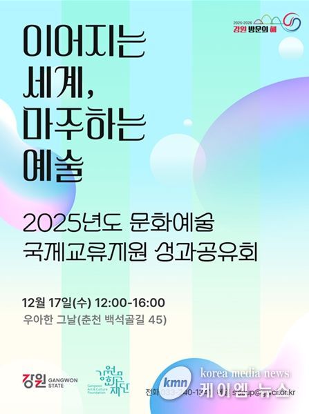 (케이엠뉴스) 강원문화재단은 2025년도 문화예술 국제교류지원사업에 참여한 예술인들과 함께 12월 17일 춘천에서 성과공유회 '이어지는 세계, 마주하는 예술' 행사를 성황리에 마무리했다고 밝혔다.