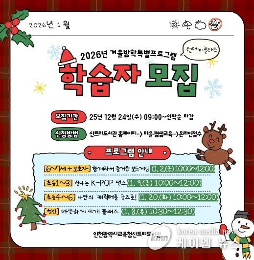 (케이엠뉴스) 인천광역시교육청신트리도서관은 겨울방학을 맞아 유·아동부터 성인까지 참여할 수 있는 ‘겨울방학 특별프로그램’을 운영한다.