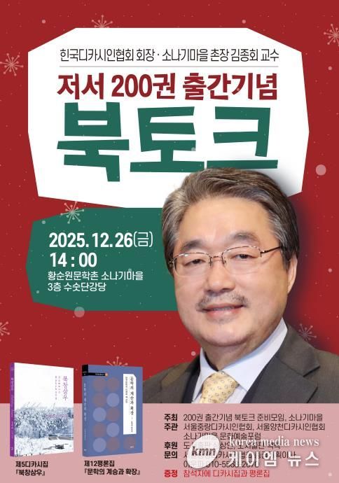 (케이엠뉴스) 황순원문학촌 소나기마을은 오는 26일 오후 2시, 김종회 촌장의 저서 200권 출간을 기념해 북토크를 개최한다고 밝혔다. 이번 행사는 양평군 서종면 소나기마을 수숫단강당 3층에서 열리며, 서울중랑디카시인협회와 서울양천디카시인협회, 소나기마을 문화예술포럼이 주관하고 200권출간기념북토크준비모임과 소나기마을이 주최한다.