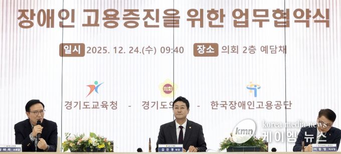 (케이엠뉴스) 경기도교육청이 24일 경기도의회 예담채에서 경기도의회(의장 김진경), 한국장애인고용공단(이사장 이종성)과 함께 장애인 고용증진을 위한 업무협약을 체결했다.