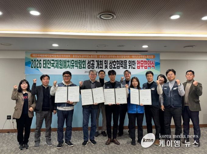 (케이엠뉴스) 태안국제원예치유박람회 조직위원회는 12월 24일 충남도청에서 충청남도공무원노동조합, 충청남도공무원노동조합협의회, 태안군공무원노동조합과 박람회 성공개최를 위한 업무협약을 체결했다.