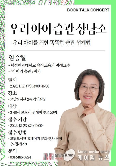 (케이엠뉴스) 김포시 모담도서관이 2026년 1월 17일 토요일 14시부터 16시까지 3~10세 부모 및 예비 부모를 대상으로 한 상담형 프로그램 '우리 아이 습관 상담소'를 운영한다.