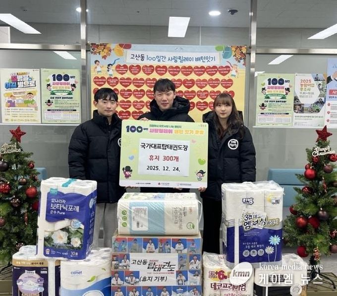 (케이엠뉴스) 의정부시 고산동주민센터는 12월 24일 고산동 소재 국가대표 탑 태권도장이 지역 저소득층을 위해 두루마리 화장지 300개를 기부했다고 밝혔다.