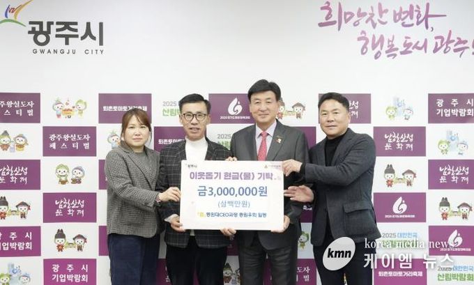 (케이엠뉴스) 광주시는 지난 24일 탄벌벽산블루밍아파트 입주자대표회의, 동원대학교 최고 경영자 과정 총원우회, 행정타운아이파크어린이집, 심부장 사표쓰고 차린집으로부터 연말 이웃돕기 성금을 기탁받았다.