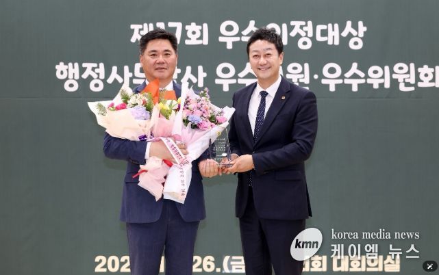 (케이엠뉴스) 경기도의회 경제노동위원회 정하용 의원(국민의힘, 용인5)이 26일 열린 2025년 경기도의회 의원 종무식 및 시상식에서 대한민국시도의회의장협의회가 주관하는 ‘제17회 우수의정대상’ 및 경기도의회가 주관하는 ‘2025년 행정사무감사 우수의원’을 동시에 수상하는 영예를 안았다.