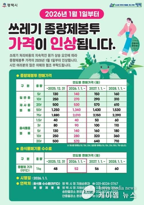 (케이엠뉴스) 평택시는 2026년 1월 1일부터 쓰레기 종량제 봉투 가격을 3개년도에 걸쳐 인상한다.