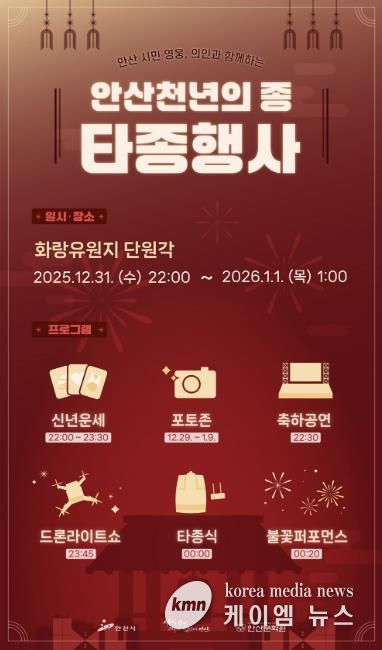 (케이엠뉴스) 안산시는 오는 31일 오후 10시부터 화랑유원지 단원각에서 ‘2026 안산 천년의 종 타종 행사’를 개최한다고 30일 밝혔다.