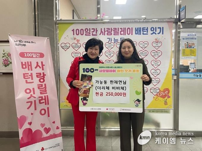 (케이엠뉴스) 의정부시 가능동주민센터는 12월 29일 더리체 비바체가 관내 어려운 이웃을 돕기 위해 성금 25만 원을 기탁하며 ‘100일간 사랑릴레이 배턴 잇기’에 동참했다고 밝혔다.