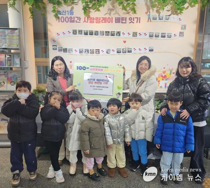 (케이엠뉴스) 의정부시 송산1동주민센터는 12월 23일 용현동 소재 예원어린이집이 어려운 이웃을 돕기 위해 성금 40만 원을 기부하며 ‘100일간 사랑릴레이 배턴 잇기’에 동참했다고 밝혔다.