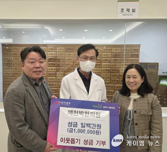 (케이엠뉴스) 양주시 광적면은 지난 29일 예천박한의원에서 관내 저소득 가정을 지원하기 위해 성금 100만 원을 기부했다고 밝혔다.