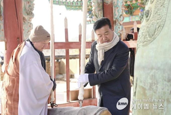 이어 수덕사 범종각에서 새해를 알리고 한 해 안녕을 기원하는 신년타종 행사에 참석했다.