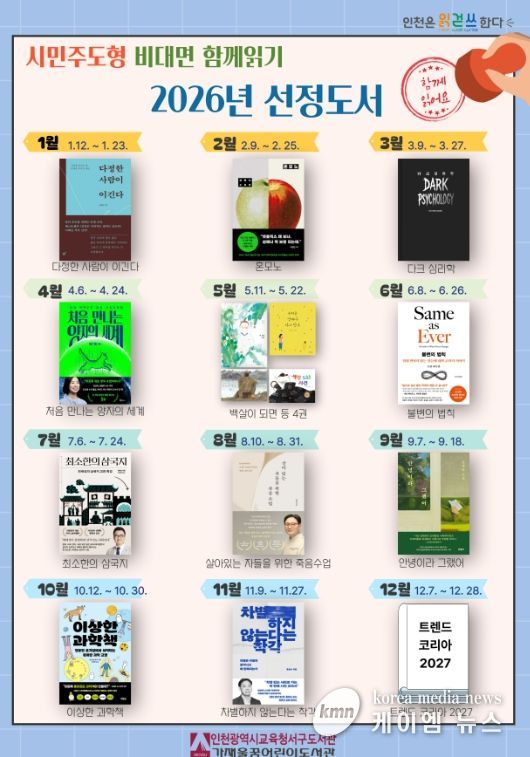 (케이엠뉴스) 인천광역시교육청서구도서관은 12월 31일 ‘2026년 시민주도형 비대면 함께읽기’ 도서 15권을 선정·발표했다.