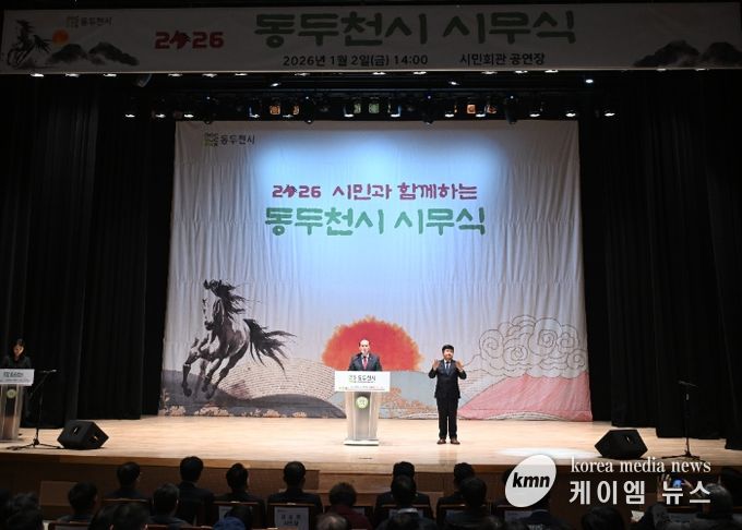 (케이엠뉴스) 동두천시는 2026년 병오년(丙午年) 새해를 맞아 1월 2일 오후 2시 시민회관 공연장에서 시민과 함께하는 ‘2026년 시무식’을 개최했다.