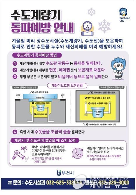 (케이엠뉴스) 부천시는 기온이 큰 폭으로 떨어지는 겨울철을 맞아 수도계량기 동파 사고에 선제적으로 대응하기 위해 내년 2월까지 ‘동절기 수도계량기 동파 예방대책’을 마련해 추진 중이다. 이번 대책은 한파에 따른 수도시설 피해를 줄이고 시민 불편을 최소화하려는 조치다.