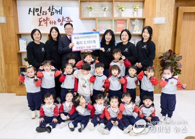 (케이엠뉴스) 양주시가 5일 애플아이어린이집으로부터 이웃돕기 성품으로 두루마리 휴지 2,151개(100만 원 상당)를 기탁받았다.
