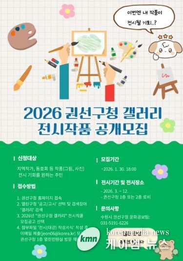 (케이엠뉴스) 수원시 권선구는 1월 30일까지 2026년 권선구청 갤러리 전시작품을 공개모집한다.