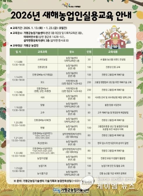 (케이엠뉴스) 가평군농업기술센터가 농업인의 영농 역량 강화를 위해 ‘2026년 새해농업인실용교육’을 오는 1월 13일부터 23일까지 실시한다.