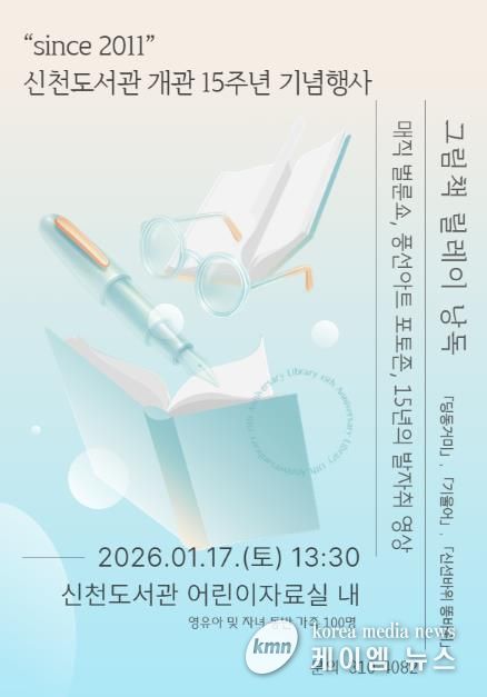 (케이엠뉴스) 시흥시는 오는 1월 17일 신천도서관에서 ‘개관 15주년 기념행사’를 열고, 유아동 및 어린이 동반 가족 100여 명을 대상으로 그림책 낭독과 마술 공연을 운영한다. 행사는 이날 오후 1시 30분부터 3시 30분까지 진행된다.