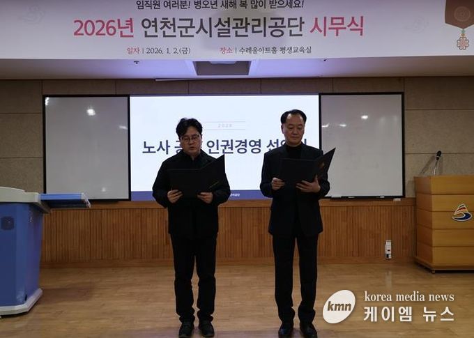 (케이엠뉴스) 연천군시설관리공단은 1월 2일 시무식 행사를 통해 노사 공동 인권경영 선언식을 개최했다고 밝혔다. 이번 행사는 새해를 맞아 노사가 함께 인권 중심의 경영을 다짐하며 2026년의 첫 발을 내딛기 위해 마련됐다.