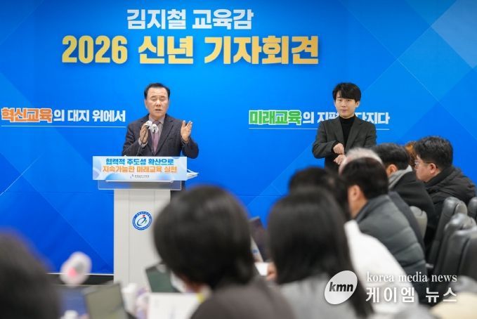 (케이엠뉴스) 김지철 충남교육감은 8일, 도교육청 회의실에서 ‘2026 신년 기자회견’을 열고, ‘2025년 주요 성과와 2026년 12대 중점 추진 과제’를 발표했다.