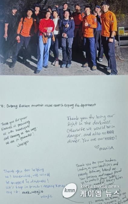 (케이엠뉴스) 경기도 구조대원의 활동으로 자칫 생명을 잃을 수도 있는 상황에서 위기를 넘긴 외국인 관광객이 감사 편지를 보낸 사실이 알려져 화제다. 화제의 주인공들은 고양소방서 산악구조대.