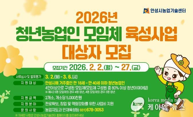 (케이엠뉴스) 안성시는 오는 2월 2일부터 27일까지 ‘청년농업인 모임체 육성사업’ 대상자를 모집한다.