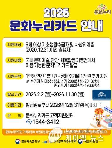 (케이엠뉴스) 정부 정책에 따라 2026년부터 통합문화이용권(문화누리카드)과 청년문화예술패스 제도가 개편된다. 이에 따라 양주시는 개편 기준에 맞춰 지역대상자를 대상으로 해당 사업을 확대 시행한다고 밝혔다.
