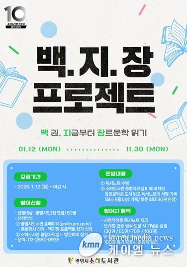 (케이엠뉴스) 광명시 소하도서관은 오는 12일부터 장르문학 도서 100권 읽기 챌린지인 ‘백.지.장 프로젝트’ 참여자를 모집한다.