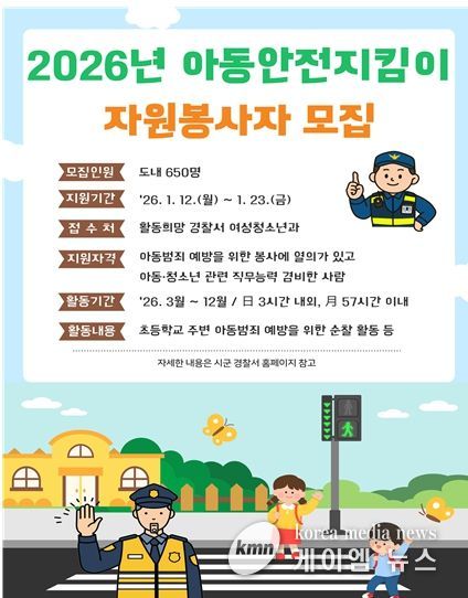 (케이엠뉴스) 강원자치경찰위원회와 강원경찰청은 아동 대상 범죄 예방을 위해 ‘2026년 아동안전지킴이 자원봉사자’를 선발·모집한다.