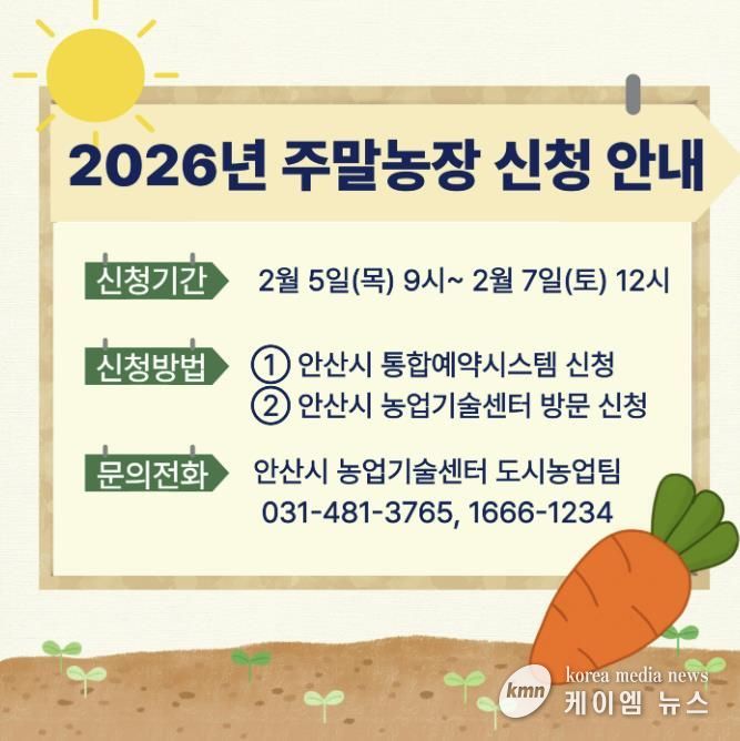 이민근 안산시장은 “주말농장은 가족이 함께 흙을 만지며 건강한 여가를 보낼 수 있는 도심 속 농업 공간”이라며 “시민들이 일상 속 자연과 교감할 수 있는 기회인 만큼, 많은 시민 분들의 참여를 기대한다”고 말했다.