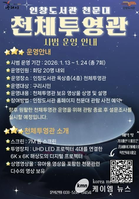 (케이엠뉴스) 구리시는 오는 1월 13일부터 24일까지 인창도서관 옥상에 설치된 천체투영관의 시범운영을 실시한다고 밝혔다.
