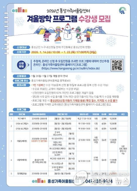 (케이엠뉴스) 홍성가족어울림센터는 관내 유아 및 초·중·고등학생을 대상으로 2026년 겨울방학 프로그램 수강생을 모집한다. 이번 프로그램은 놀이 중심의 체험형 교육을 강화하고, 보호자와 함께 참여할 수 있는 수업을 포함해 가족이 함께 즐길 수 있는 문화 활동으로 구성됐다.