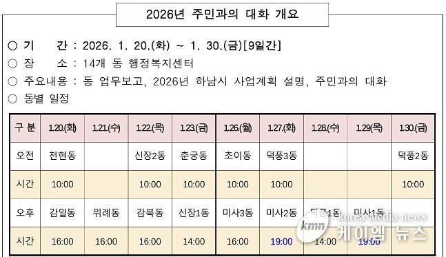 (케이엠뉴스) 하남시는 오는 1월 20일부터 30일까지 관내 각 동 행정복지센터를 순회하며 ‘2026년 주민과의 대화’를 개최한다고 밝혔다.