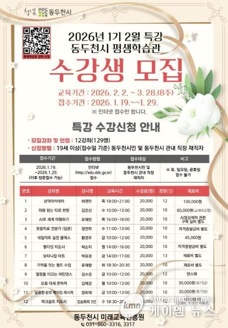 (케이엠뉴스) 동두천시는 시민의 자기계발과 평생학습 참여 기회를 확대하기 위해 2026년 평생학습관 2월 특강 수강생을 모집한다고 밝혔다.