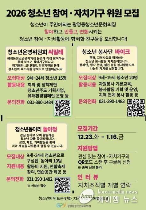 (케이엠뉴스) (재) 군포시청소년재단 군포시청소년지역센터 광정동청소년문화의집은 2026년을 맞아 다양한 청소년 참여ㆍ자치기구를 모집한다고 밝혔다.