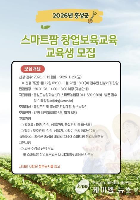 (케이엠뉴스) 홍성군에서는 스마트농업 창업과 확산을 위해 스마트팜 창업보육교육의 교육생을 오는 23일까지 모집한다.
