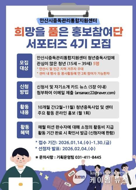 (케이엠뉴스) 안산시는 안산시중독관리통합지원센터가 오는 30일까지 청년중독예방사업 홍보를 위한 ‘희망을 품은 홍보참여단 서포터즈’ 4기를 모집한다고 14일 밝혔다.